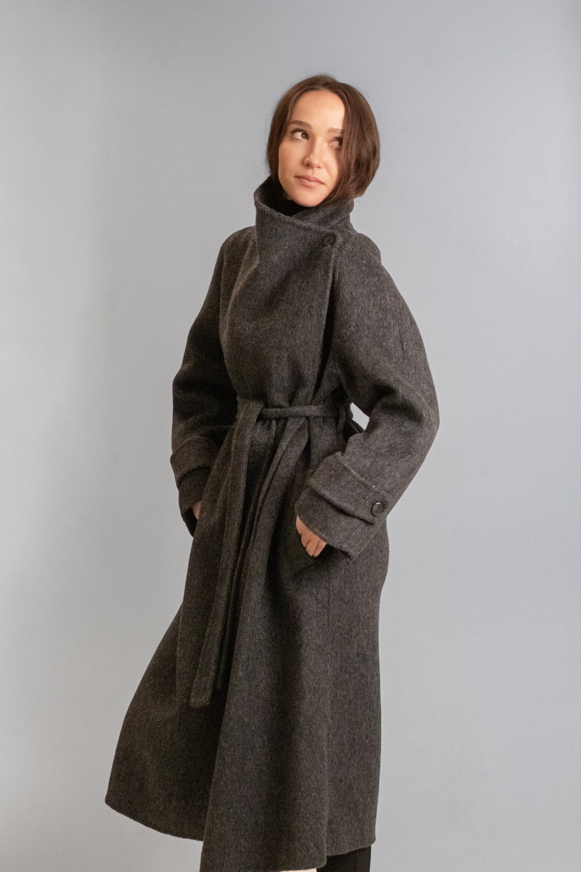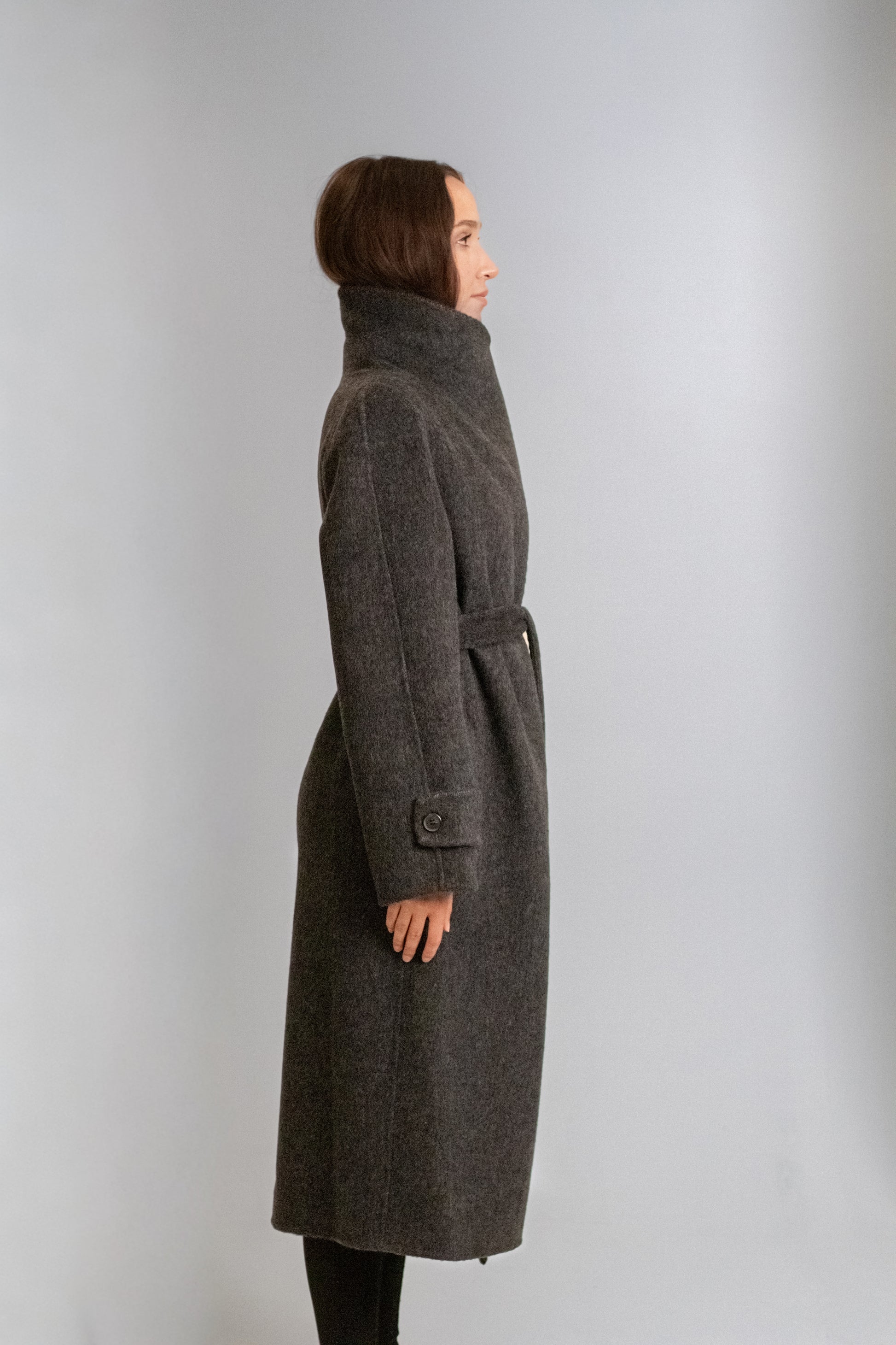 This elegant long coat, made of 70% natural wool, offers both warmth and modern sophistication. The high collar provides extra protection from the cold, while the belt at the waist creates a graceful silhouette.